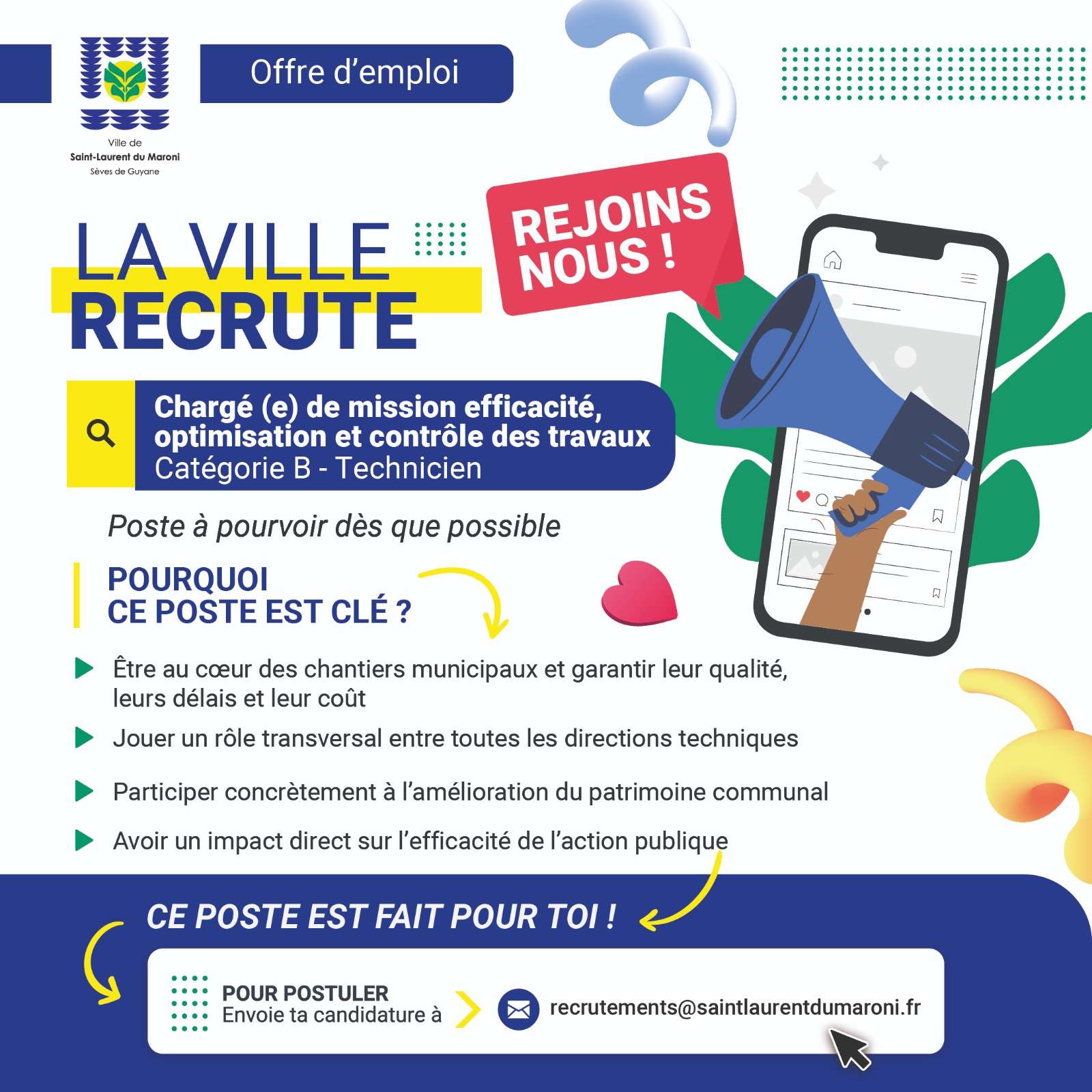 - Expérience : 3 à 5 ans dans le suivi ou le contrôle de travaux (idéalement en collectivité).