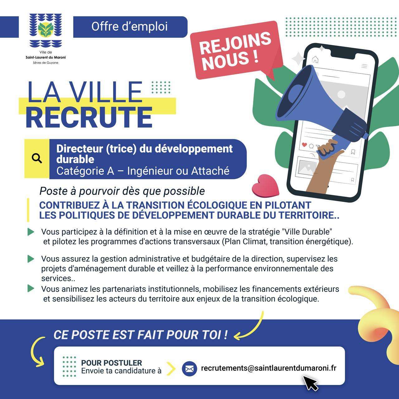 La Ville de Saint-Laurent du Maroni recrute un(e) Directeur(trice) du développement durable afin de piloter et structurer sa stratégie de transition écologique.